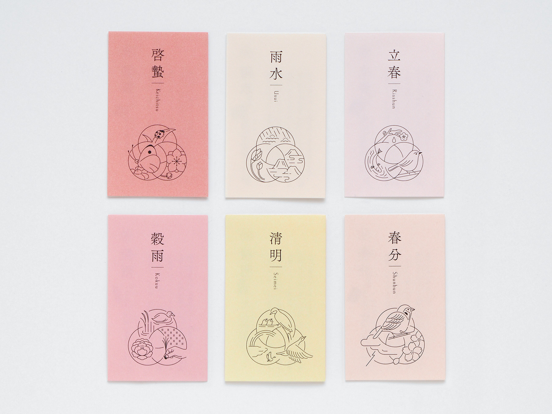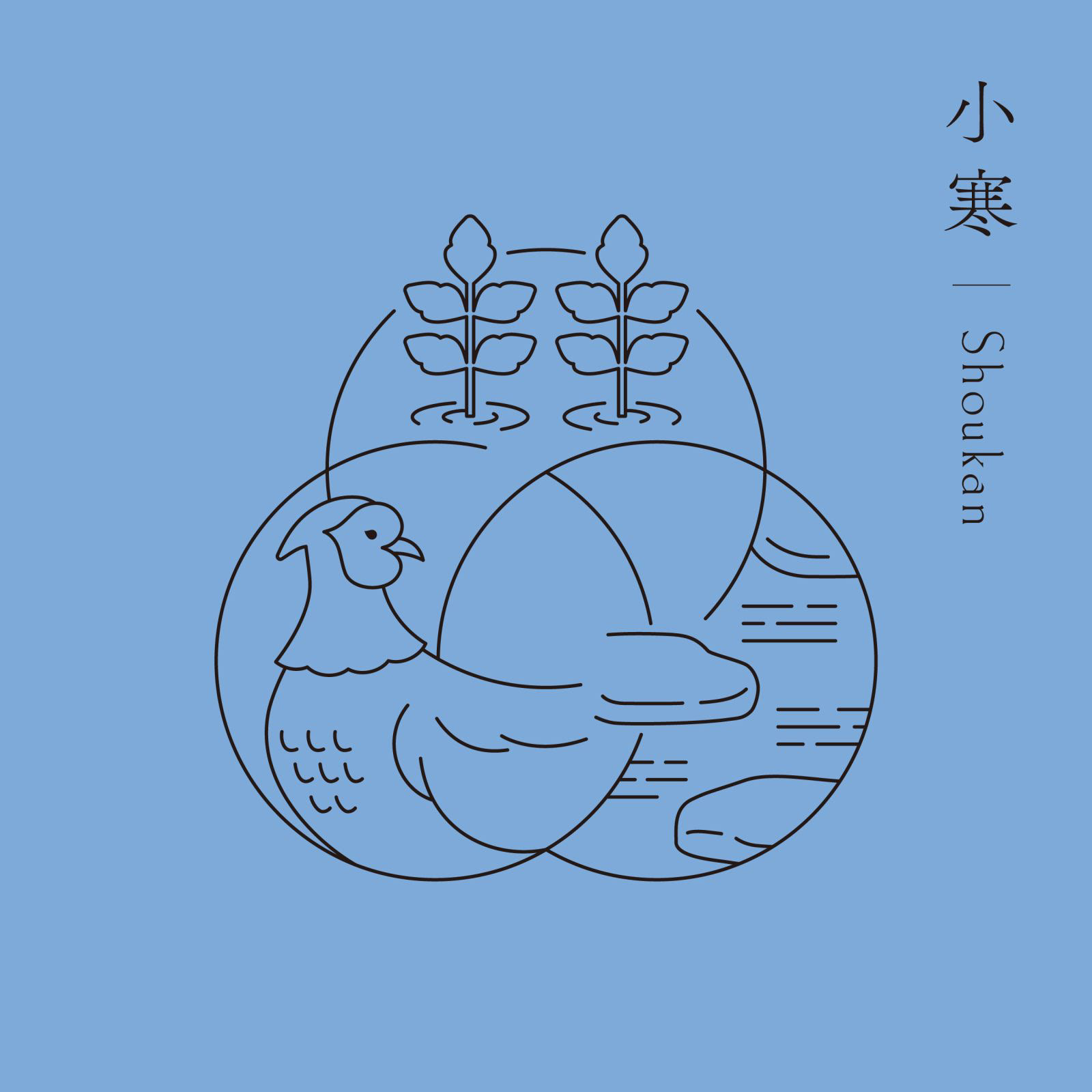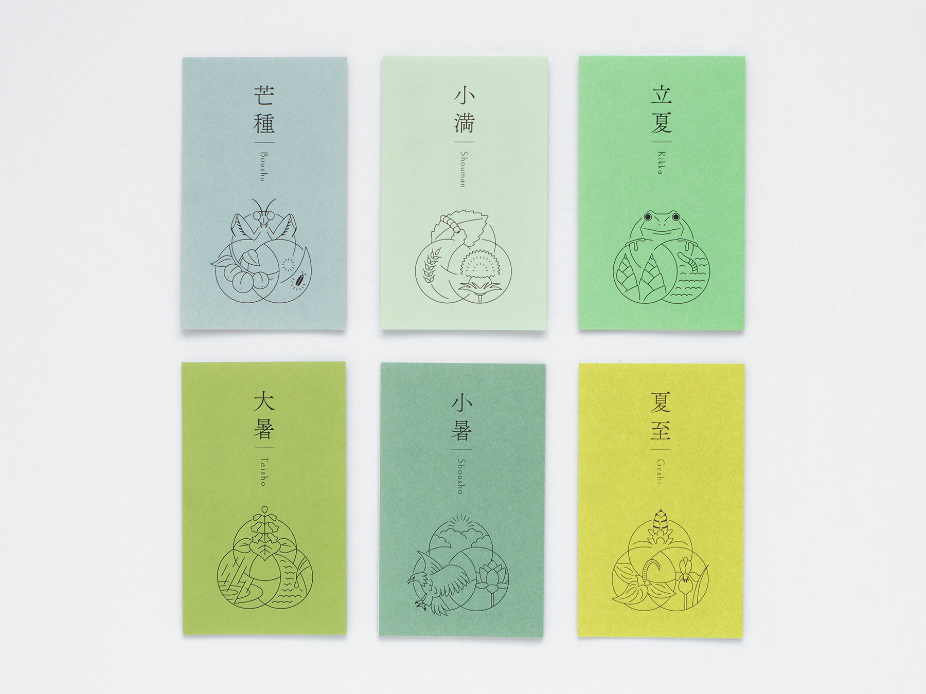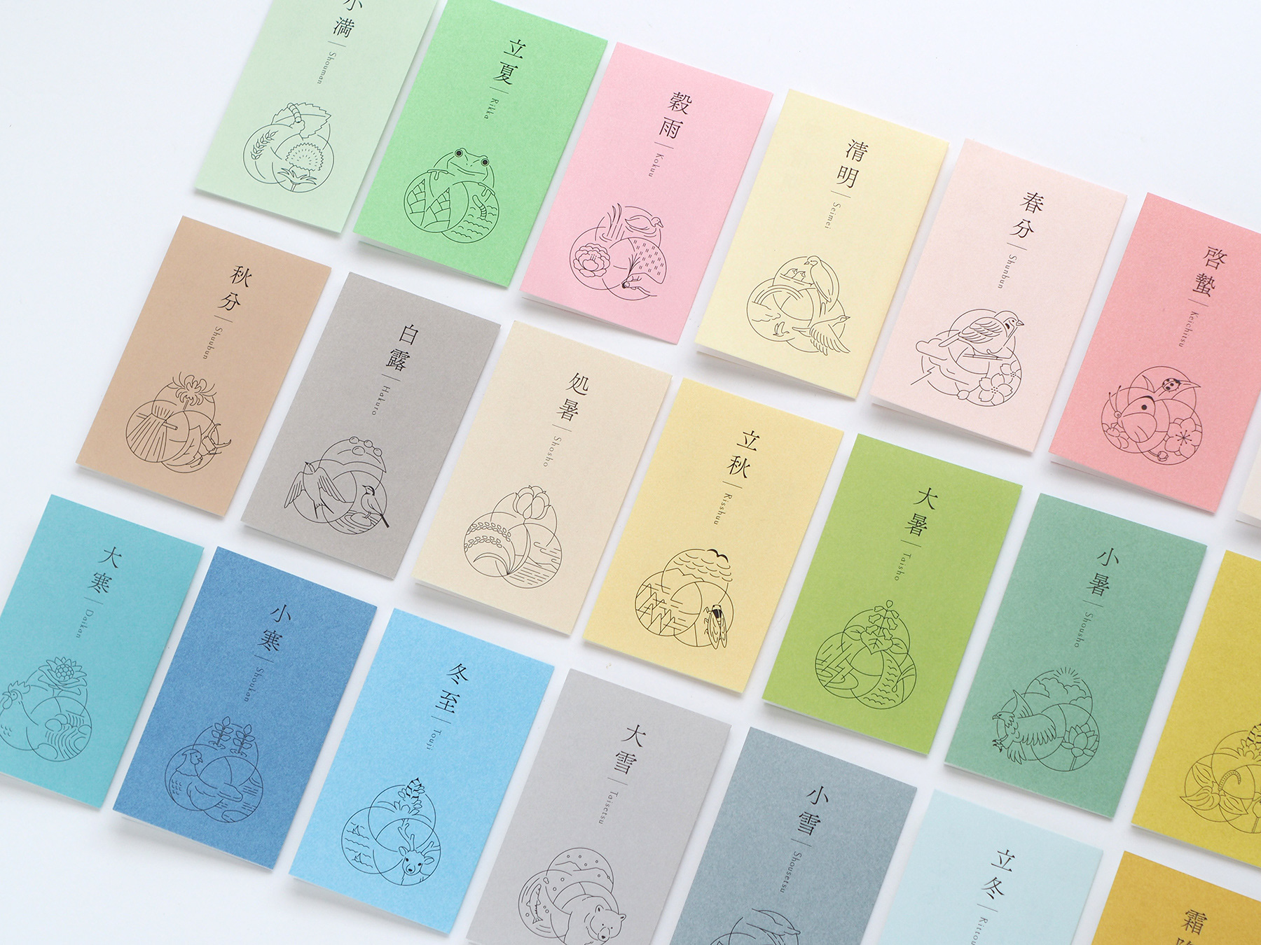 きのえねomoyaでは、料理と共に二十四節気について記されたカードを提供しています。初候・次候・末候それぞれの事象をイラストレーションとしてシンボル上に表現し、DICカラーガイドに定義された日本の伝統色を配色しています。