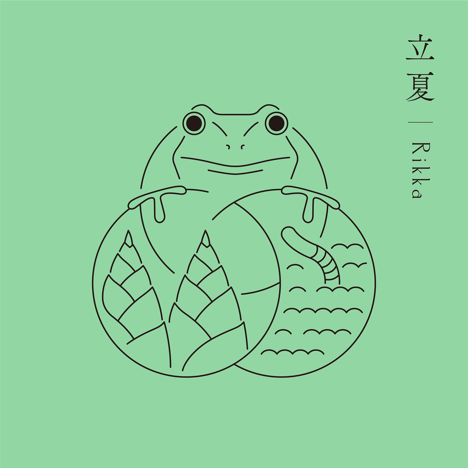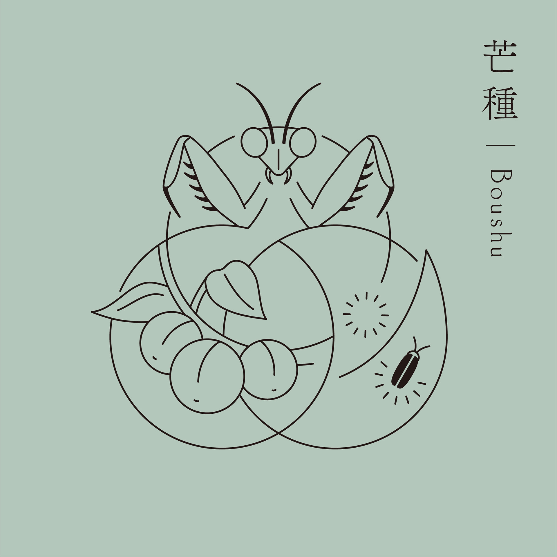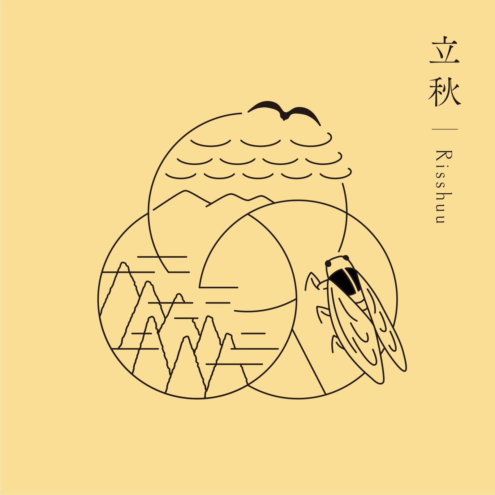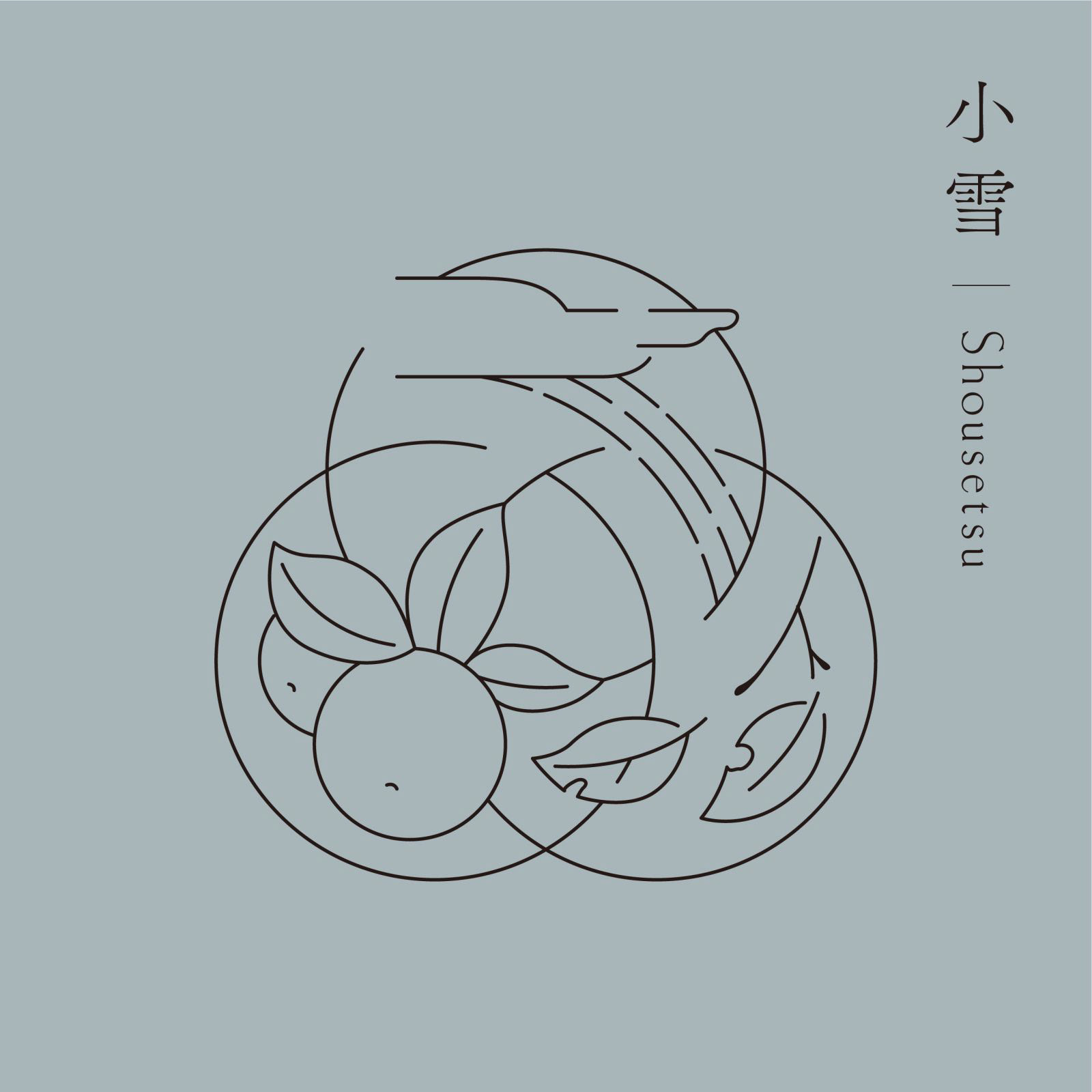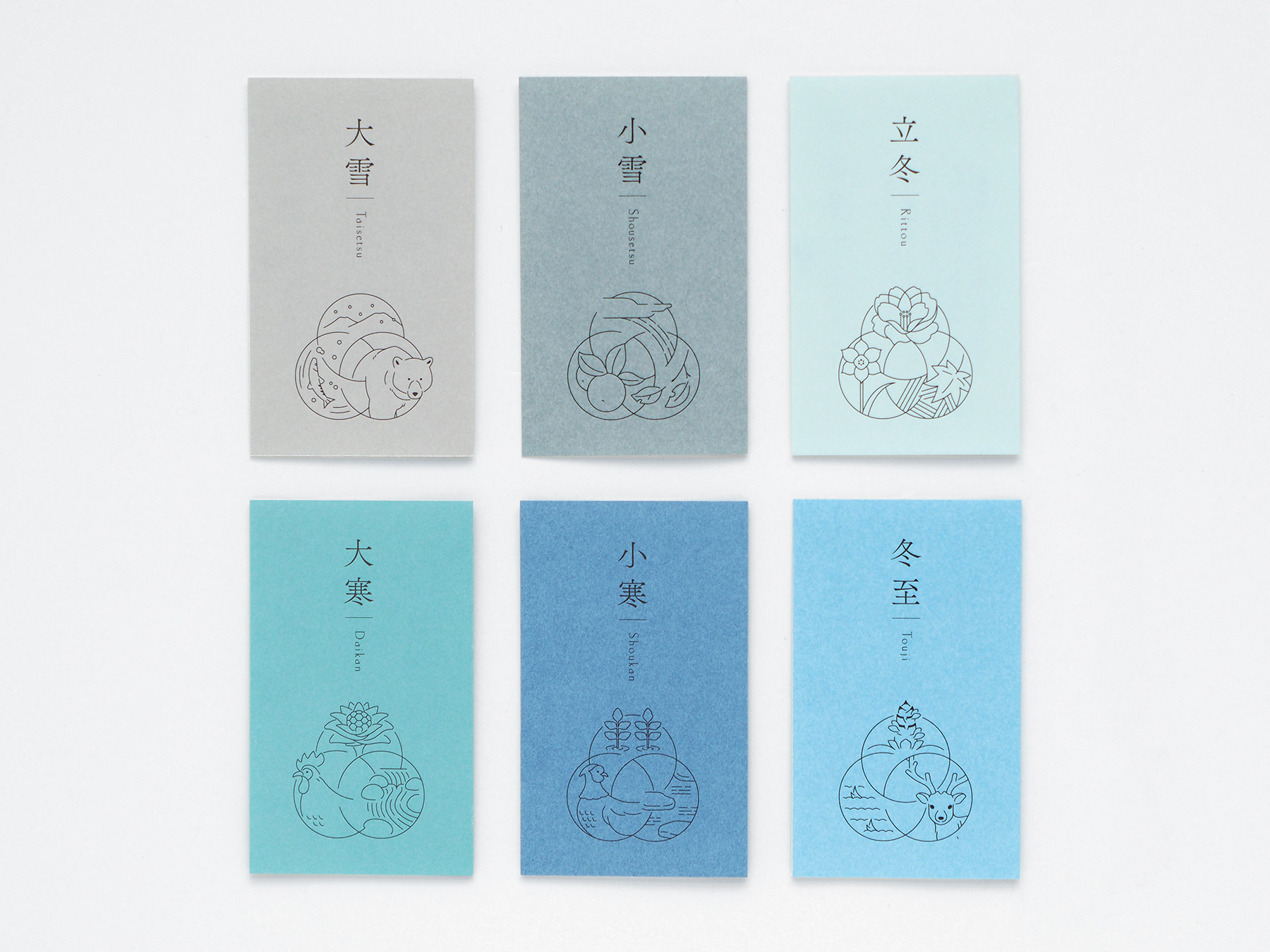 きのえねomoyaでは、料理と共に二十四節気について記されたカードを提供しています。初候・次候・末候それぞれの事象をイラストレーションとしてシンボル上に表現し、DICカラーガイドに定義された日本の伝統色を配色しています。