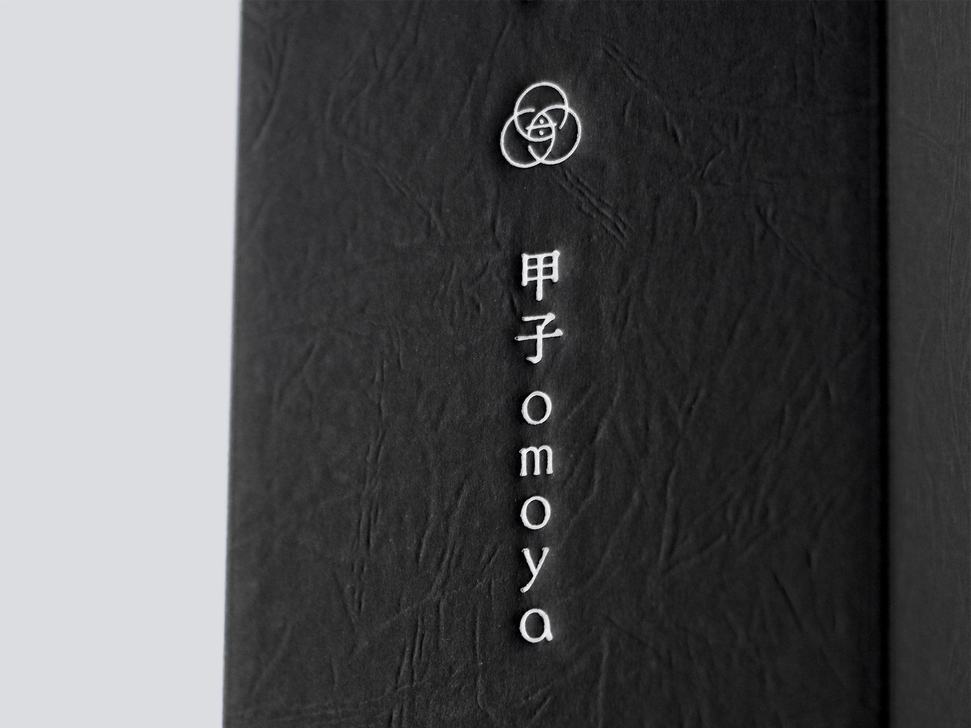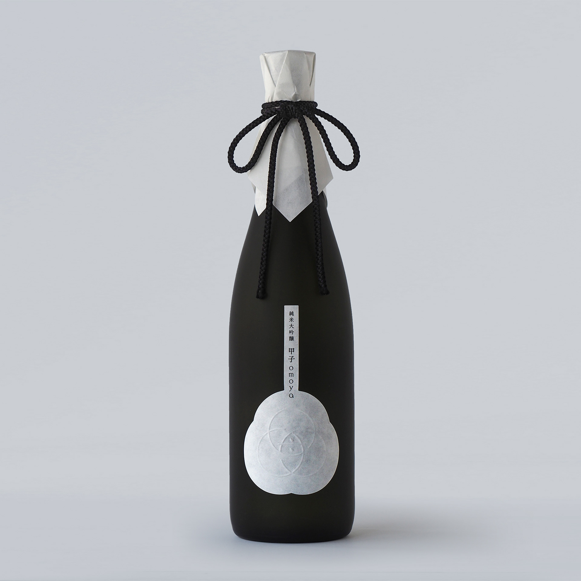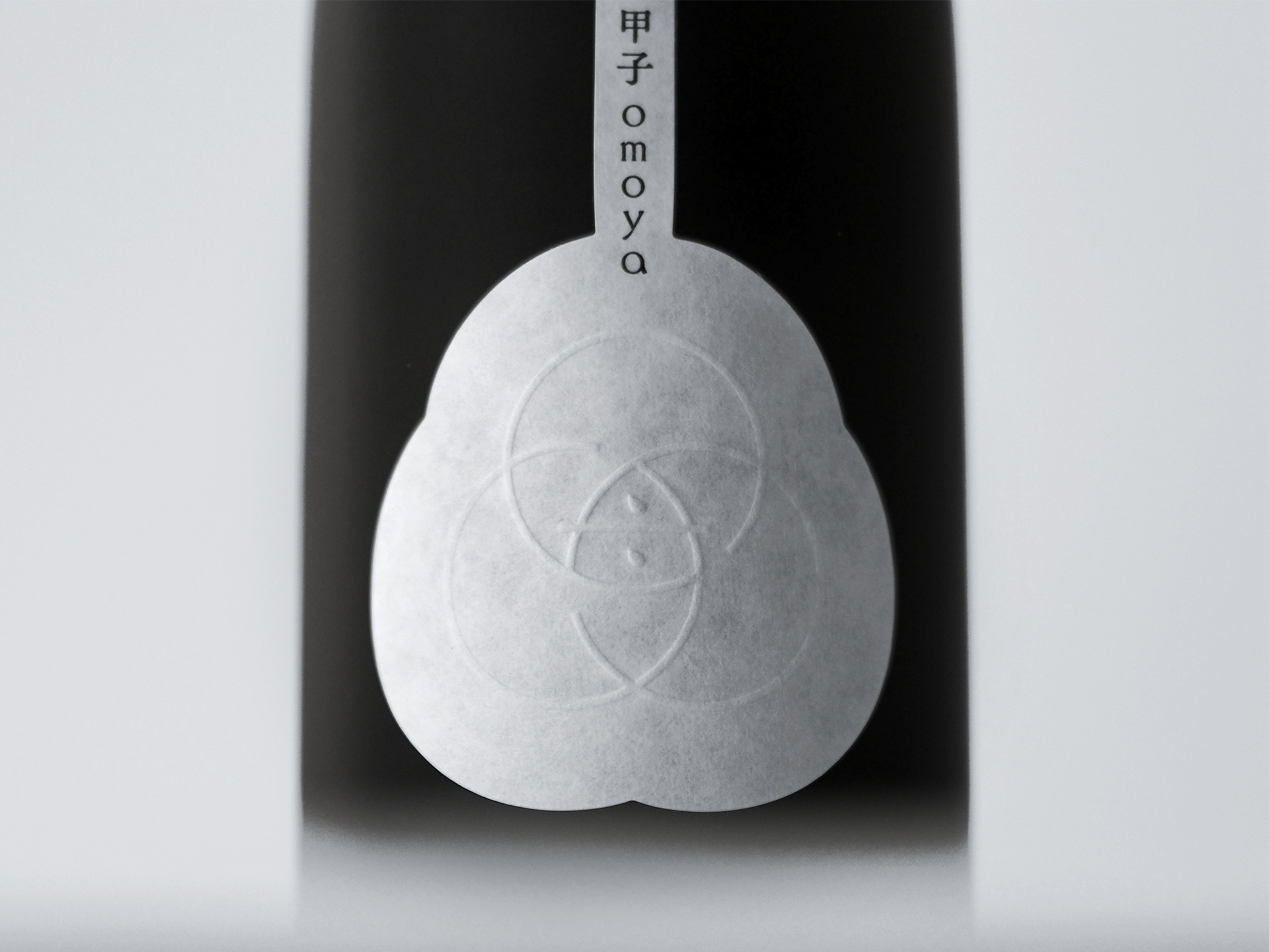 白箔を施した化粧箱、シンボルを空押しした和紙や、懐紙を用いた被せ紙によって、限定酒である「純米大吟醸 甲子omoya」をデザインしています。