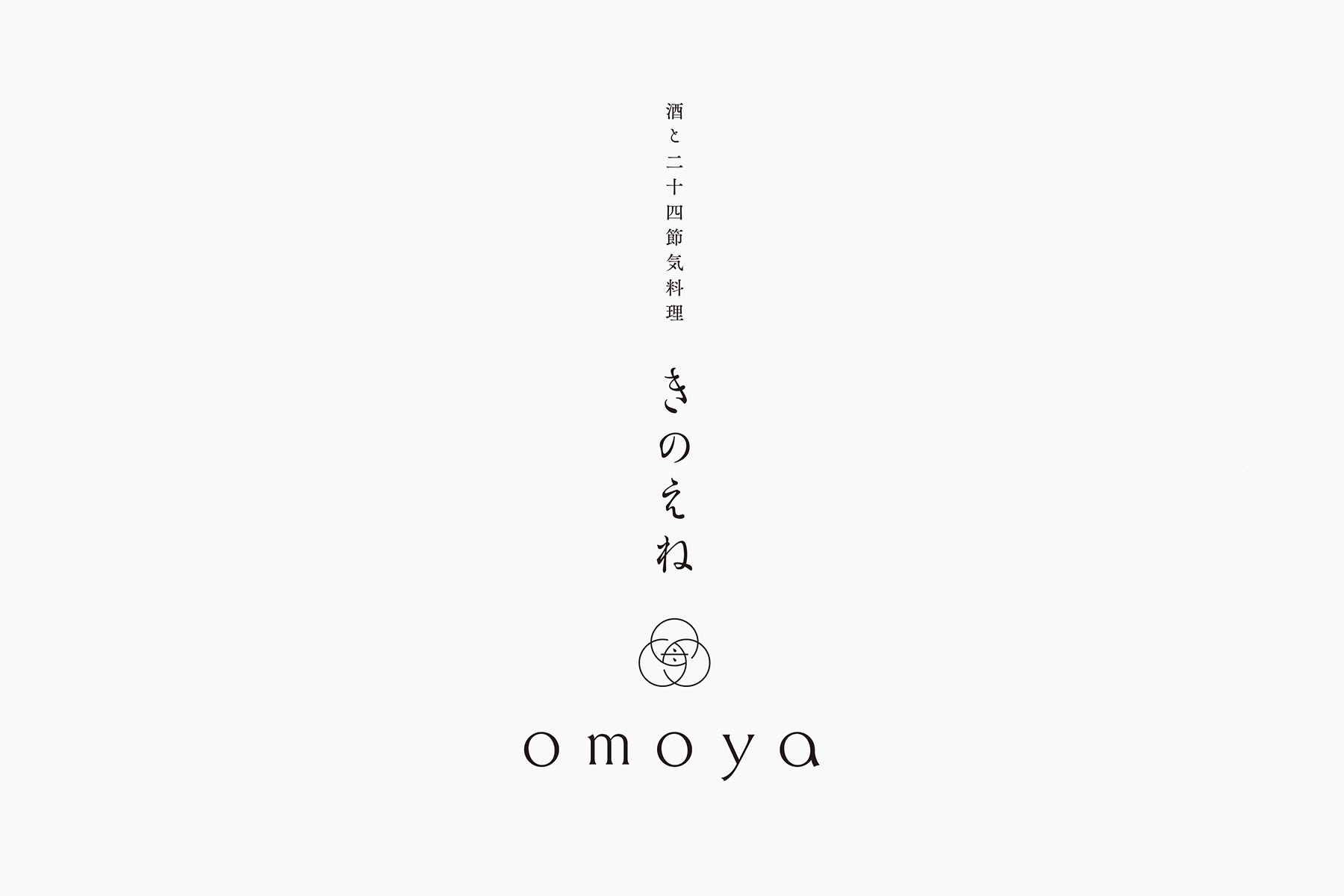 きのえねomoyaで提供されるのは、酒造りとも密接な関わりがある二十四節気を表現した料理です。二十四節気とは、1年を約15日ごとに24の節気で区分し、季節の移り変わりを表したもの。古代中国で考案され、日本でも古くから農業や季節行事の目安とされてきました。一つの節気は、初候・次候・末候という3つの候で構成され、気象の動きや動植物の変化が細かく定義づけられており、これらの総称を「七十二候」といいます。きのえねomoyaのシンボルは、「omoya」の文字を構成する三つの円を初候・次候・末候と定義し、これらを組み合わせ、中心に「母屋(おもや)」の母の文字を加えてデザインしています。