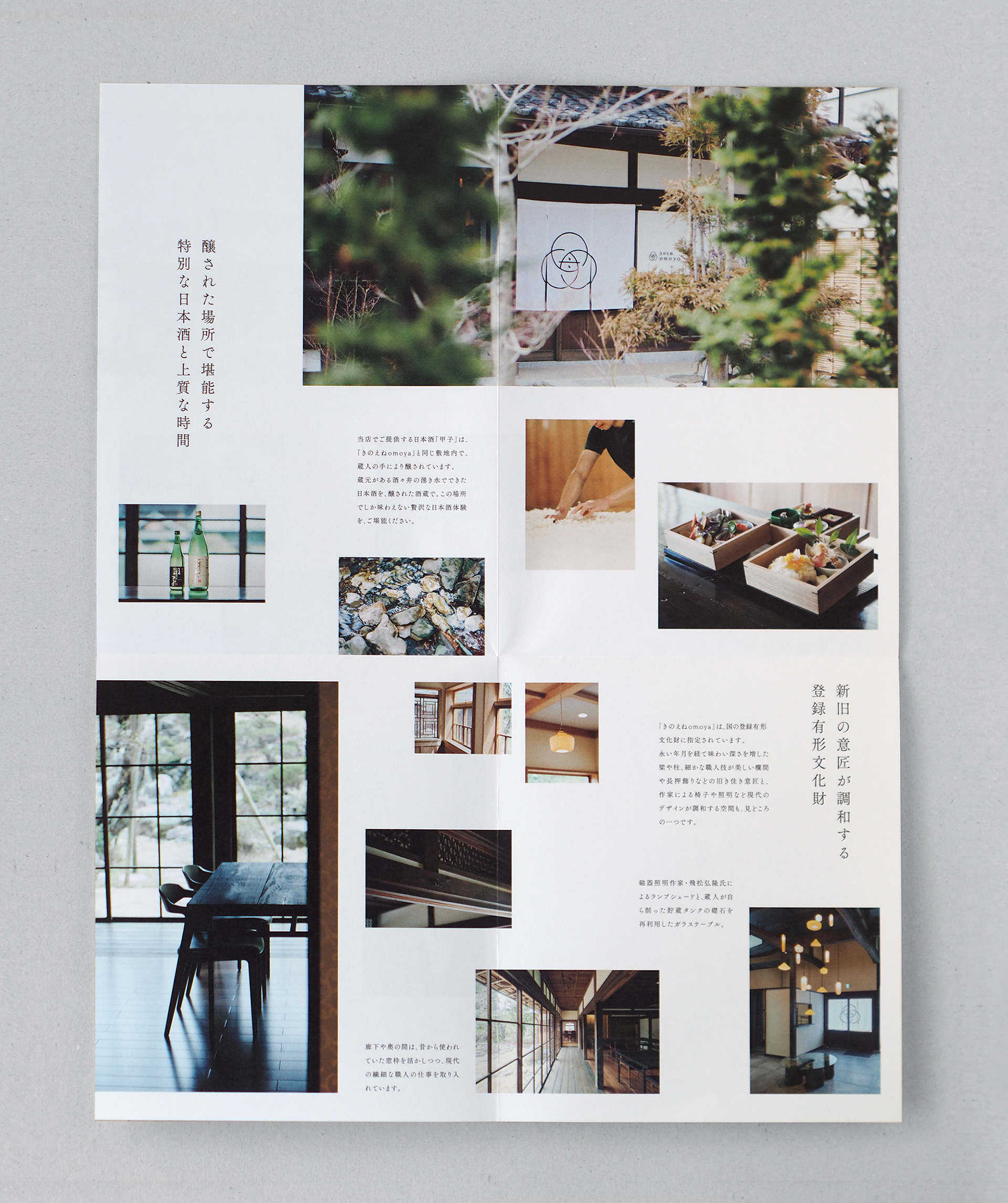 千葉県酒々井町の酒蔵「飯沼本家」の敷地内。代々の当主が住み継いできた築三百年以上の母屋(重要文化財)を大規模改修し、2022年に新たに、酒と二十四節気料理「きのえねomoya」が誕生しました。古い梁や建具と現代作家によるインテリアが融合した空間、名店「よし邑」の料理長を監修にむかえた旬の料理、蔵元でしか味わえない特別な日本酒など、上質な時間を味わえる古民家レストランです。tegusuでは、ネーミングやコンセプトの整理から、VIデザイン、テーブル上のツール、印刷物、WEB、限定日本酒など、全体的なディレクションやデザインを行いました。