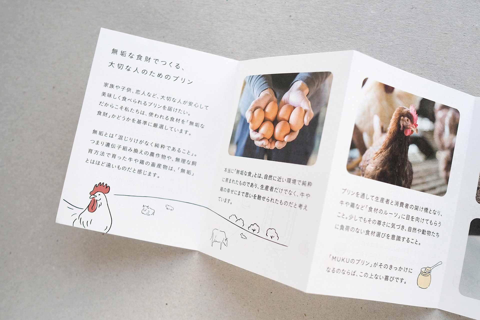 「無垢な食を、大切な人へ」を理念に、動物に負荷の少ない環境で育て上げられた作物を、安心・安全な製法で人々に届けることを目的に作られたブランド「MUKU」。tegusuでは、「MUKUのプリン」の販売にあわせ、VIの設計やパッケージ、WEBサイトなどを担当しました。(プリンの販売は既に終了しています)