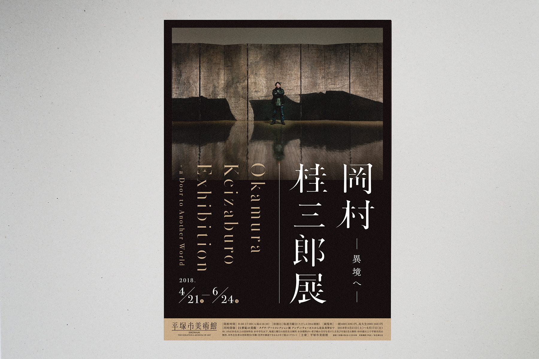 tegusuでは展覧会広報物のメインビジュアルや印刷物のデザインを担当しました。展覧会名称の和文・欧文は、杉板を削って生まれる岡村氏の作品をイメージし、一部を削り取ったような印象に仕上げています。また色彩が少なく静寂を感じさせる作品の印象に調和するよう、全体をブラックに統一し、作品の重厚感を引き立てています。