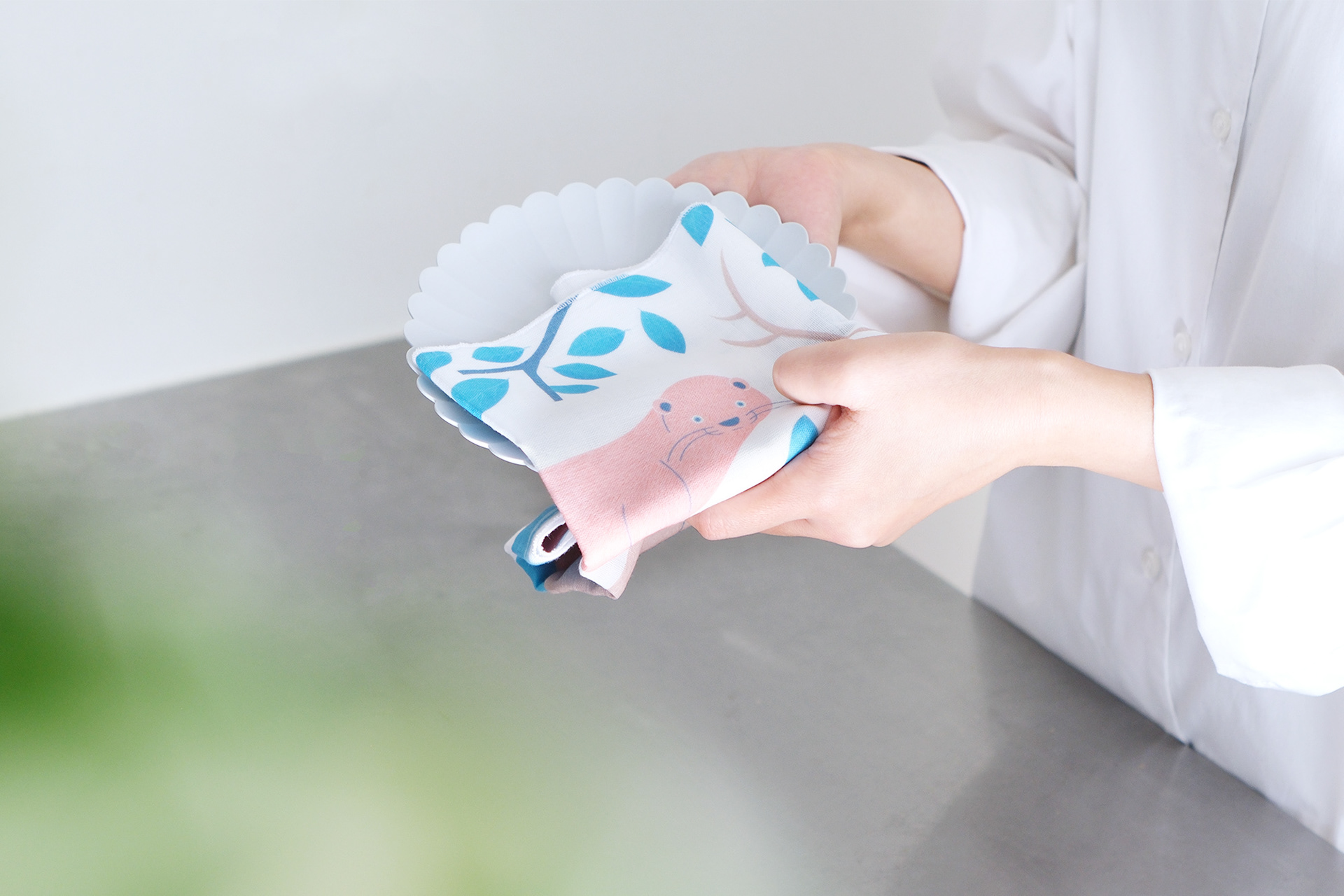The artwork on the tenugui hand towels is based on a graph of freshwater organisms that have declined by 83% in the 50 years from 1970 to 2018 due to the effects of overuse and pollution of water resources. In contrast to the graph, which shows a steady decline, the artwork powerfully depicts freshwater species in danger of extinction, looking forward and living in the present, within the natural order of things.